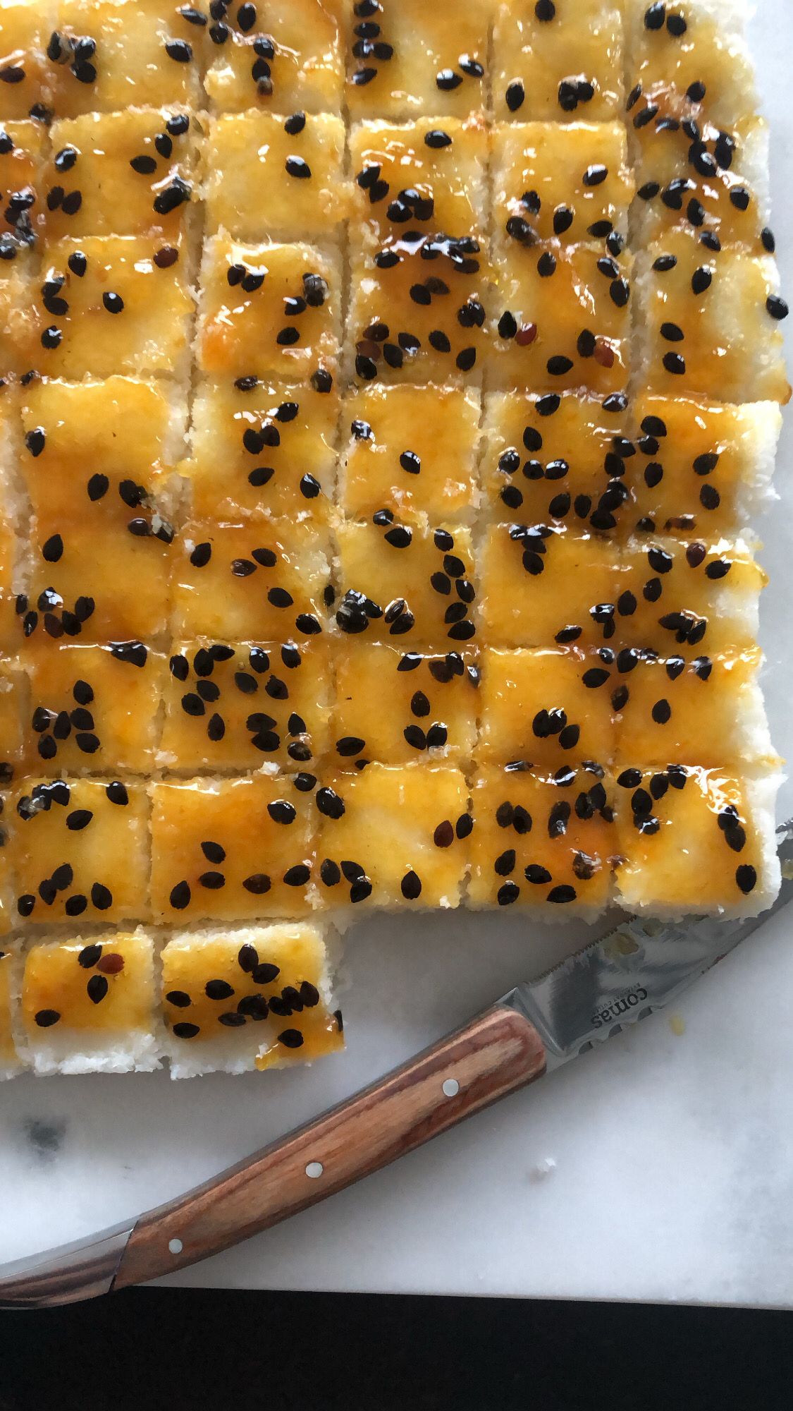 מוציאים את הקוקוס שהתקשה מהמקרר ומצפים בריבת הפסיפלורה. את יתרת הריבה שומרים בצינצנת במקרר. חותכים לקוביות ומגישים.